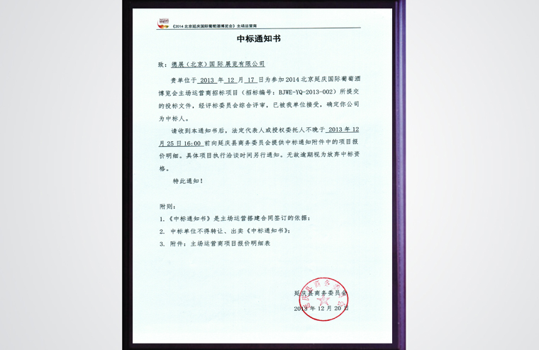 2013年12月17日,我公司參加了2014北京延慶國際葡萄酒博覽會主場運營招標項目(招標編號:BJWE-YQ-2013-002),共有8家企業一起競標,2013年12月20日下午,喜訊傳來,我們收到了延慶縣商務委員會的中標通知書,大家都為之振奮,再一次證明了團隊的力量是戰無不勝的。12月25日,延慶縣商務委員會相關領導一行5人到我集團北京本部工廠蒞臨考察。