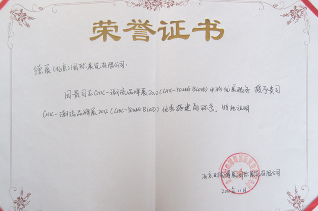 展會結束后,主辦方授予我集團CHIC—潮流品牌展2012(CHIC—Young