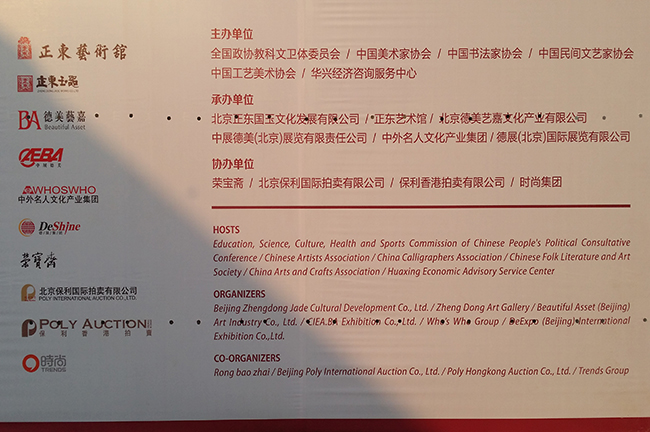 此屆盛會是由全國政協教科文衛體委員會、中國美術家協會、中國書法家協會、中國民間藝術家協會、中國工藝美術協會、華興經濟咨詢服務中心共同主辦,北京正東國玉文化發展有限公司、正東藝術館、北京德美藝嘉文化產業有限公司、德展(北京)國際展覽有限公司、中展德美展覽有限責任公司、中外名人文化產業集團聯合承辦,榮寶齋、北京保利國際拍賣有限公司、保利香港拍賣有限公司、時尚集團聯合協辦。