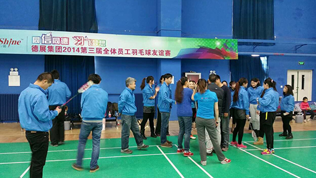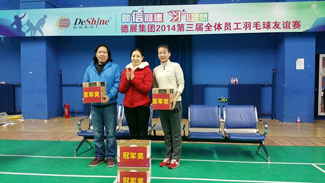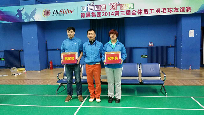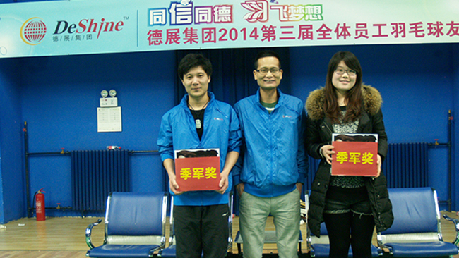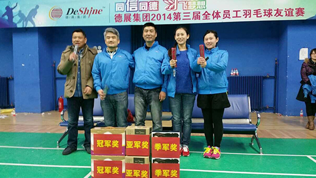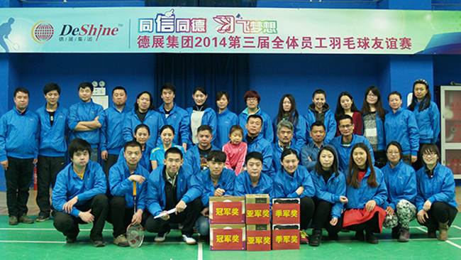 2014年歲末,同“信”同德 “羽”飛夢想,德展集團2014第三屆全體員工羽毛球友誼賽圓滿結束,在強身健體、展示大家青春活力的同時,很好地增進了各位員工間的友誼和凝聚力,營造一個自信、陽光、充滿朝氣、永不服輸的企業氛圍。 在聚餐晚宴上,集團董事長要求辦公室這樣的比賽今后每年要不斷創新、繼續舉辦下去。