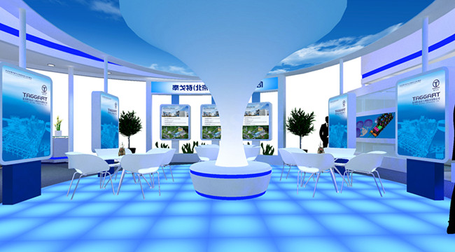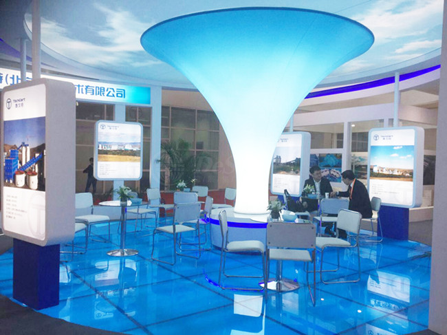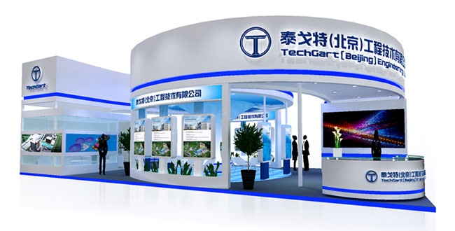 該展臺線條設計方中有圓,方是為人之本,是做人的脊梁;圓是成功之道,是處世的錦囊,傳遞著企業發展及為人之道。醒目的科技藍和LED大屏,彰顯出企業的科技與實力。醒目通透的燈箱圖片,恰當的人流路線,綠色環保的洽談氛圍,芝麻開花節節高的發光軟膜花瓣,給人耳目一新之快感。